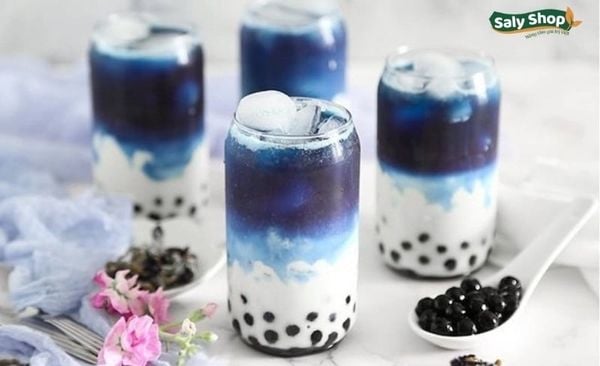 - Trang trí bắt mắt: Sử dụng trân châu hoa đậu biếc có màu tím xanh hòa cùng nền sữa trắng để tạo hiệu ứng phân tầng nổi bật. Thêm hoa đậu biếc tươi, pudding hoặc thạch trái cây để ly nước thêm hấp dẫn và đậm chất nghệ thuật.