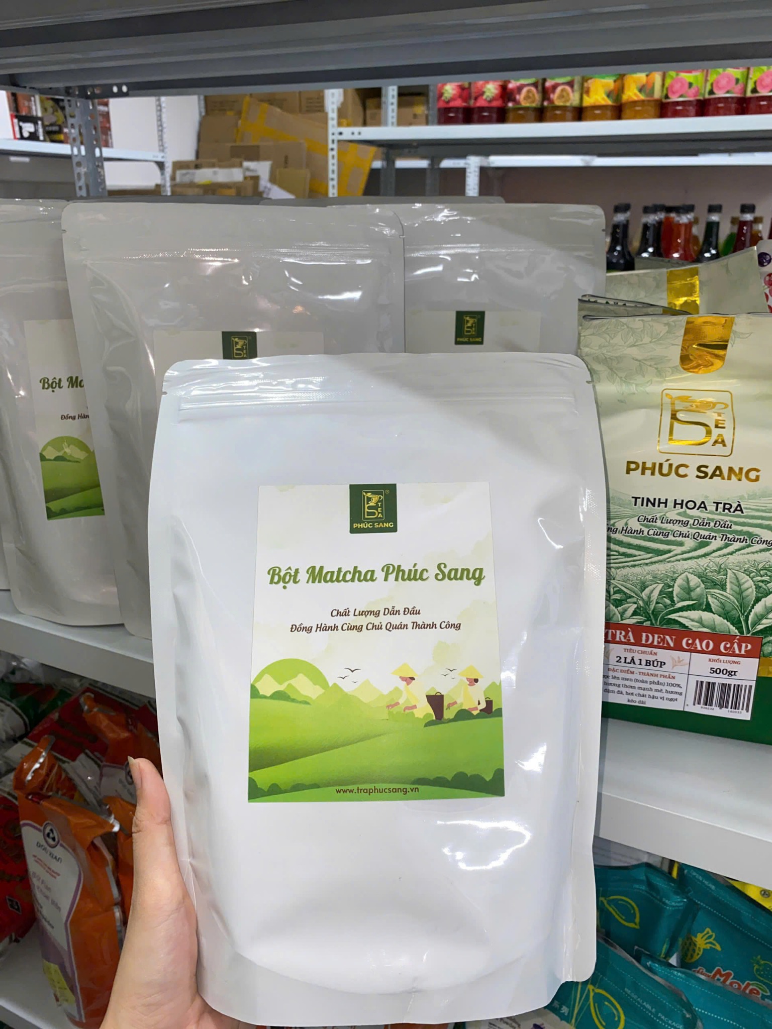Bột Matcha trà xanh Phúc Sang - nguyên liệu không thể thiếu cho chủ quán kinh doanh các món đồ uống Hottrend từ matcha. Với hương thơm tự nhiên, vị đắng nhẹ đặc trưng và màu xanh mướt mắt, bột matcha Phúc Sang giúp bạn dễ dàng tạo ra các món matcha đá xay, trà sữa matcha hay latte matcha, matcha kem trứng nướng,...